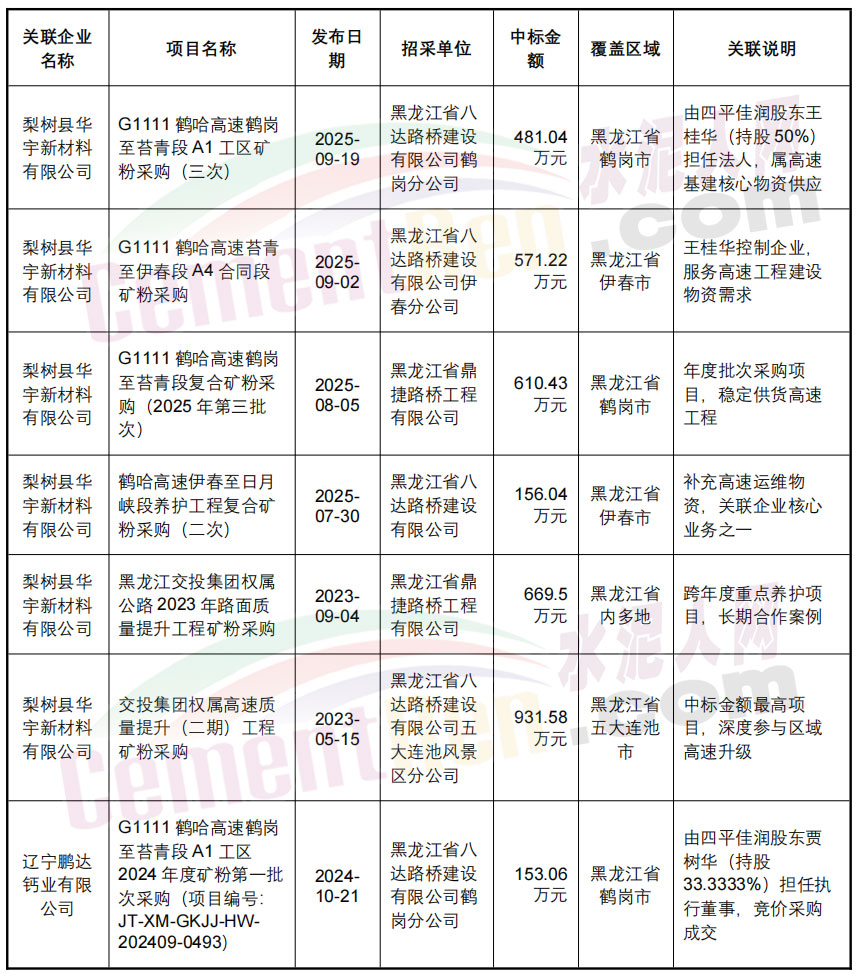企业股权结构呈现三足鼎立格局,王桂华、贾树华、姜瑶各持股33.33%左右,姜瑶担任执行董事兼总经理,王桂华任监事。其关联企业布局已渗透东北建材产业链,实际控制人王桂华控股50%的梨树县华宇新材料有限公司,2025年在黑龙江省多项高速公路矿粉采购项目中中标,中标金额累计超2000万元;股东贾树华则掌控辽宁鹏达钙业等四家企业,业务覆盖钙业加工、建材贸易等领域,形成跨区域关联经营网络。